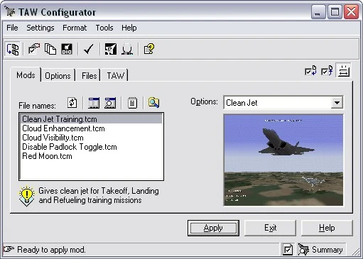 TAWC is a program by MGonzales that allows for individual mods to be swapped in and out in an extracted TAW. TAWC also allows you to tweak the game settings and the Heads-Up Display (HUD).