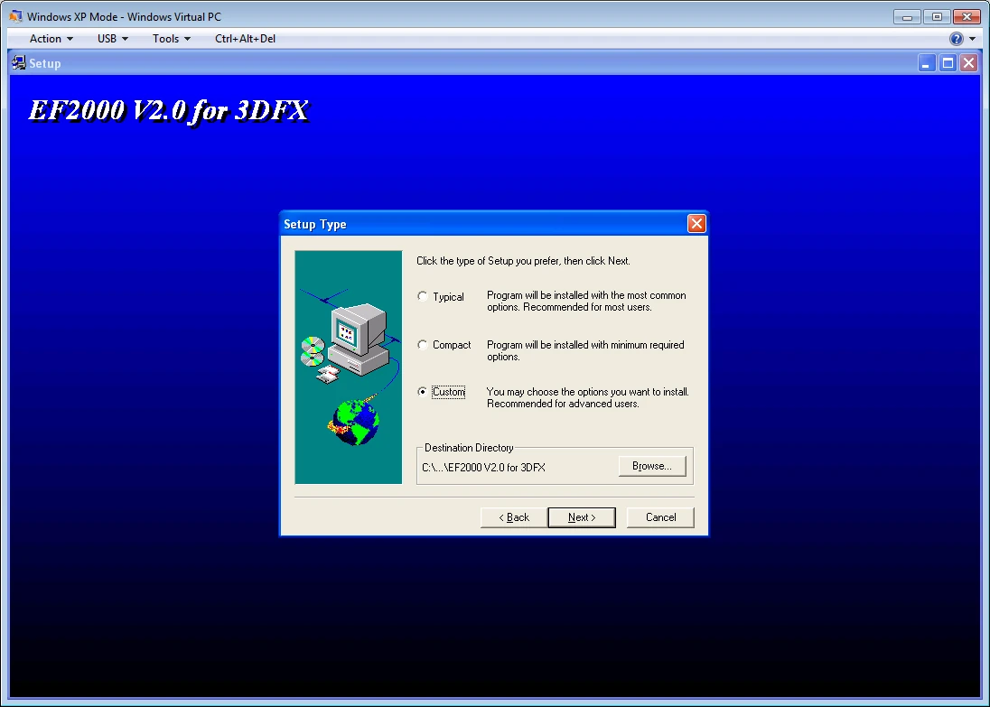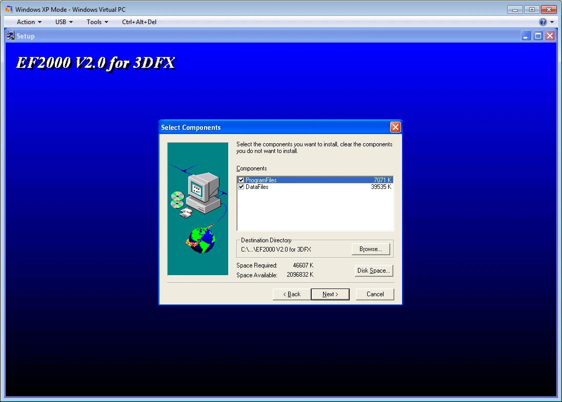 Select the EF2000 v2.0 for 3DFX option on the Autorun screen, and the installer will start. When you get to the screen where you choose the Destination Location, you will want to choose a folder on the C drive. This is because while you have "network" access to your Windows 7/8 drives, the installer does not recognize them. Therefore, you must install to the C drive for now.