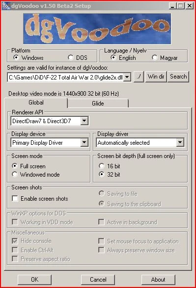 At this point, run Zeckensack's Glide configurator from your Start Menu. Select "Application Specific Overrides" and scroll down until you see an entry called F22.dat (this entry was created when you first launched TAW in Glide mode). Select F22.dat and make the following changes: