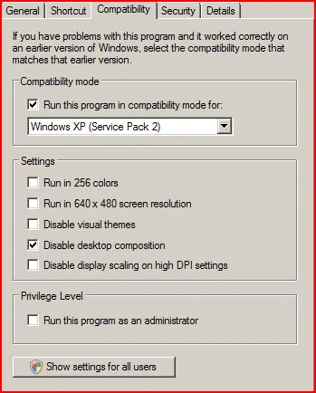 - Compatibility Mode: Windows XP SP2 (not strictly required, but it doesn't hurt anything and may help with unforeseen issues)